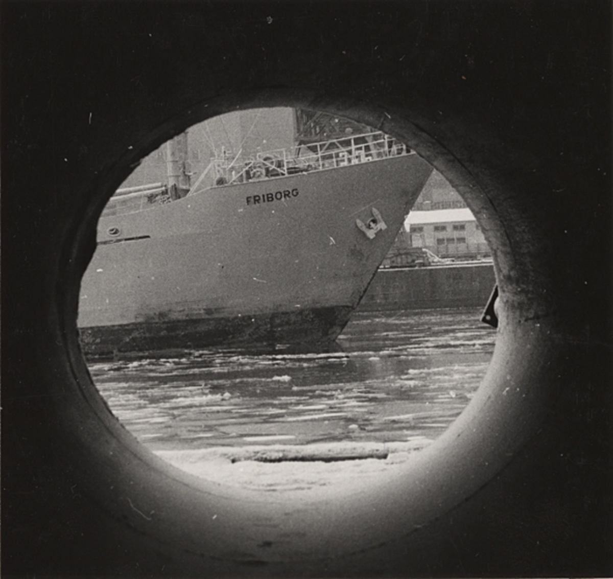 "Utsikt" genom EXPRESS I:s nedskrotade skorsten.