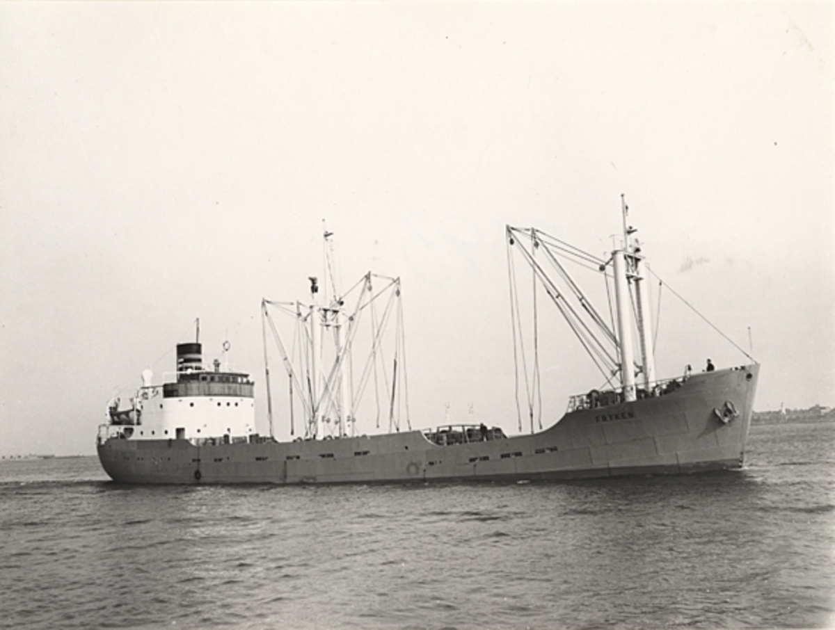 Foto i svartvitt visande lastmotorfartyget "FRYKEN" taget i Köpenhamn någon gång under 1950-talet.