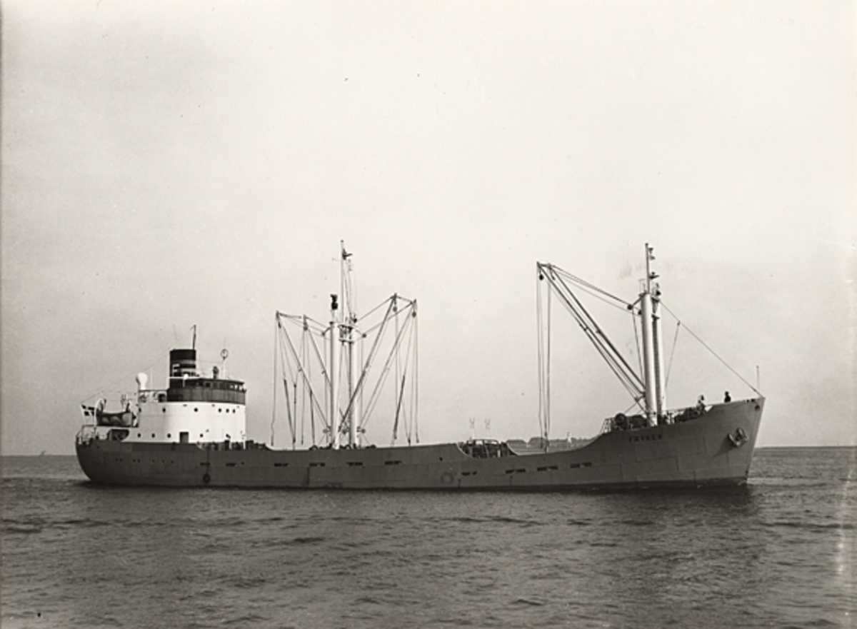 Foto i svartvitt visande lastmotorfartyget "FRYKEN" taget i Köpenhamn någon gång under 1950-talet.