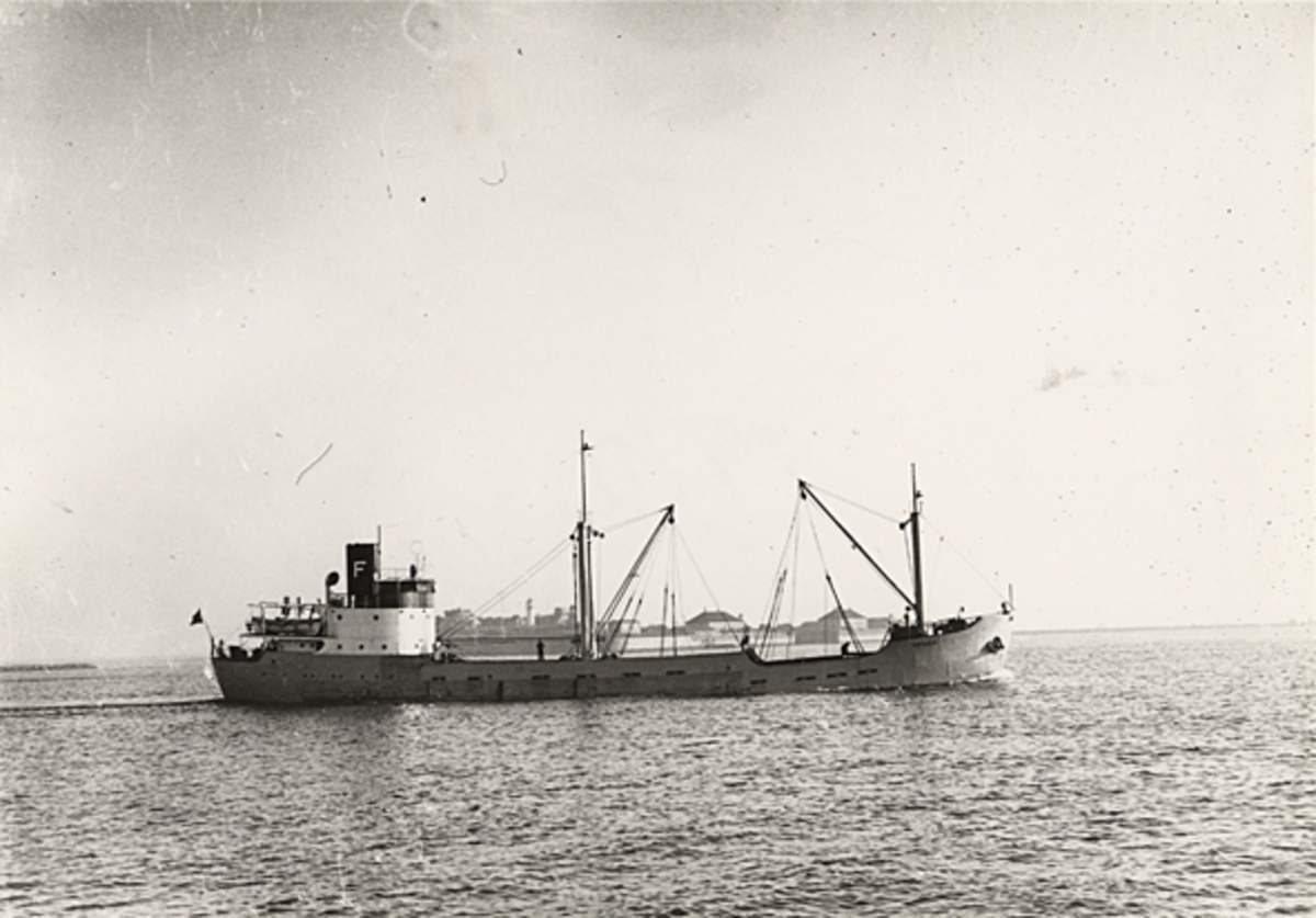 Foto i svartvitt visande lastmotorfartyget "FRYKEN" i Köpenhamn.