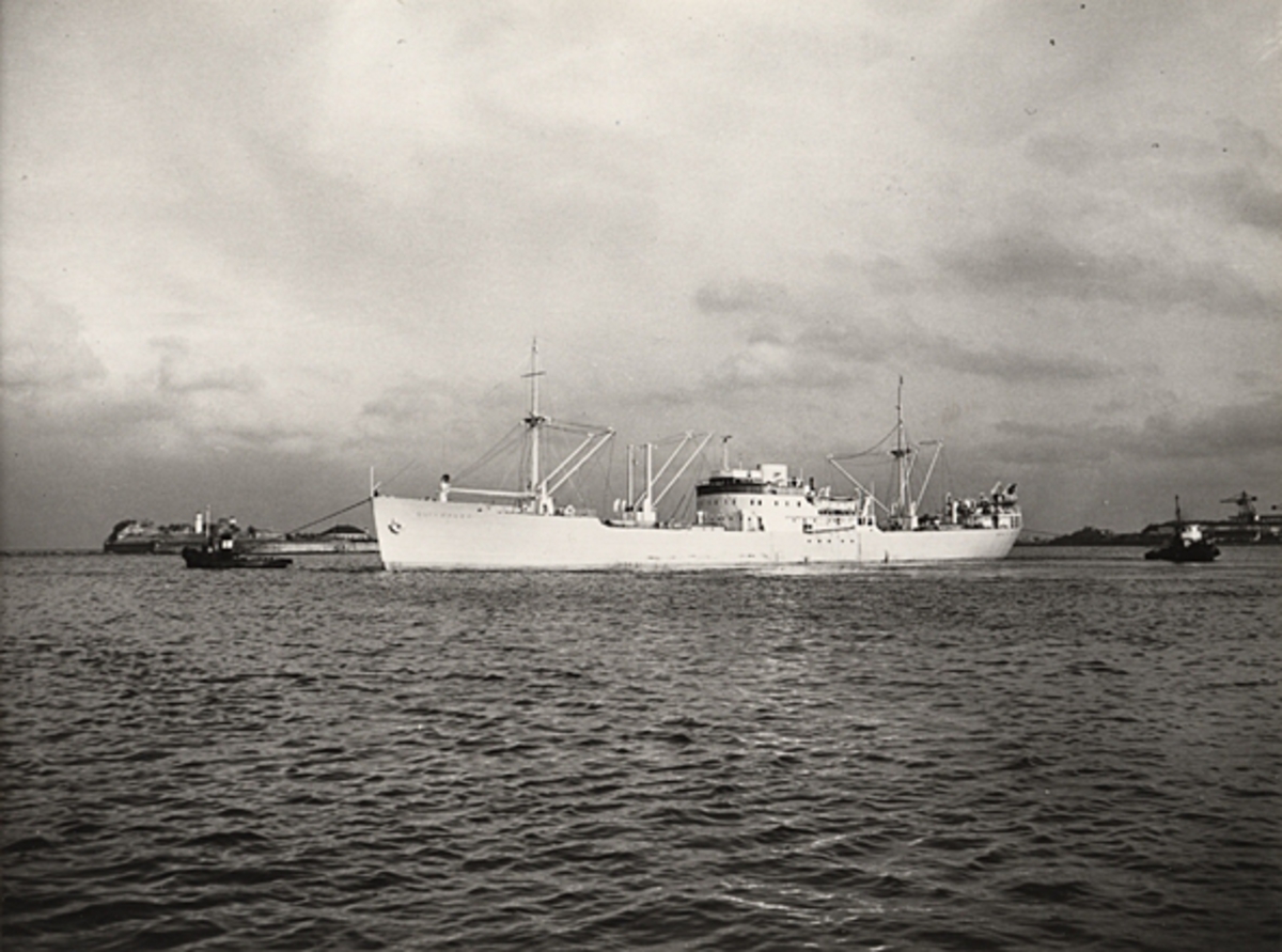 Foto i svartvitt visande lastmotorfartyget "GLIMMAREN" taget i Köpenhamn under år 1958.