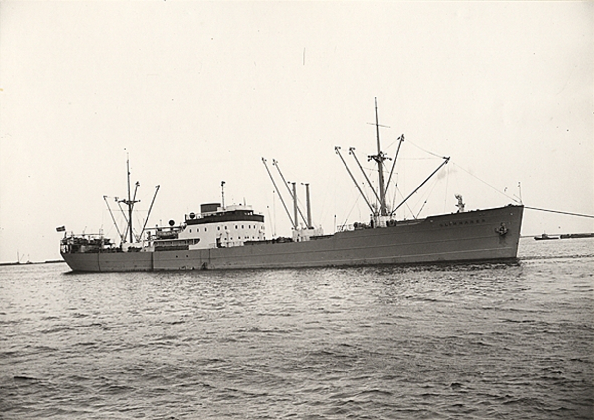 Foto i svartvitt visande lastmotorfartyget "GLIMMAREN" taget i Köpenhamn den 5.9.1956.