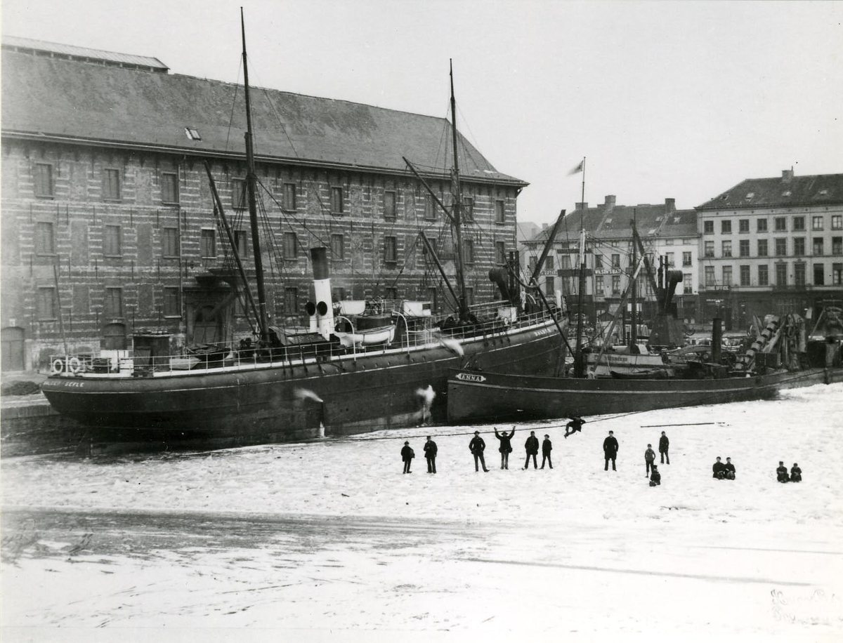 Vinterbild från hamnen. Bakladdaren Anna och Gävlebåten Balder.