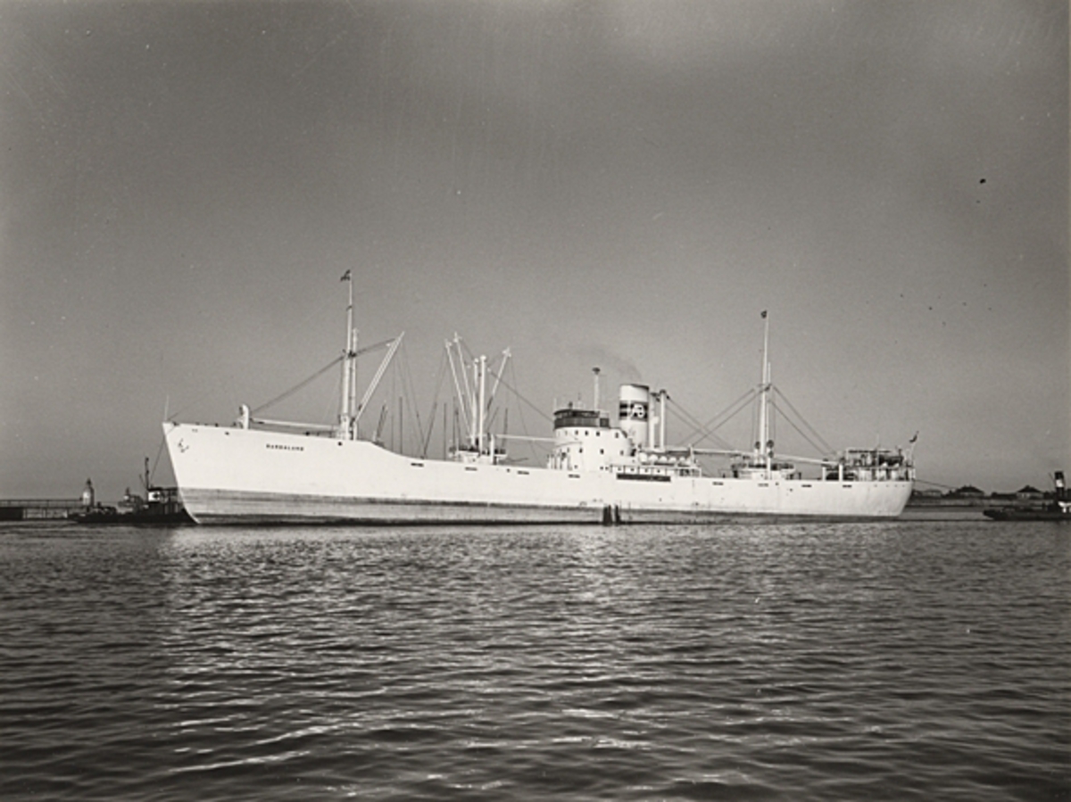 Foto i svartvitt visande lastmotorfartyget "BARDALAND", taget i Köpenhamn den 22.5.1956.