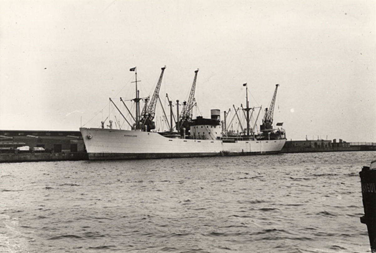 Foto i svartvitt visande lastmotorfartyget "BARDALAND" i Köpenhamn.