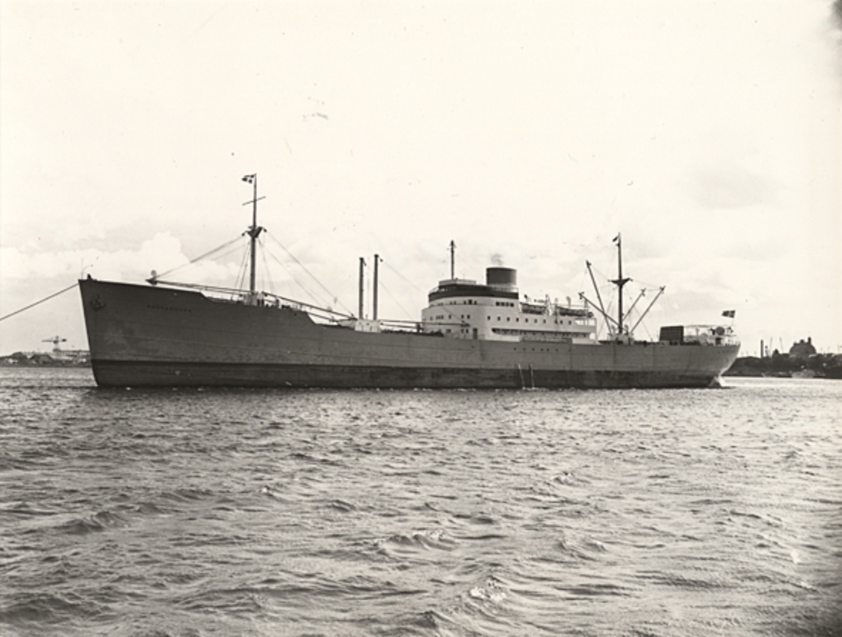 Foto i svartvitt visande lastmotorfartyget "BARRANDUNA" i Köpenhamn under år 1953.