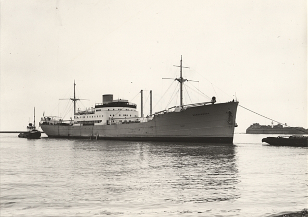 Foto i svartvitt visande lastmotorfartyget "BARRANDUNA" i Köpenhamn.