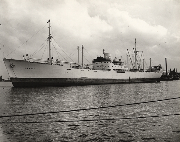 Foto i svartvitt visande lastmotorfartyget "BENGAL" i Köpenhamn under augusti månad 1954.