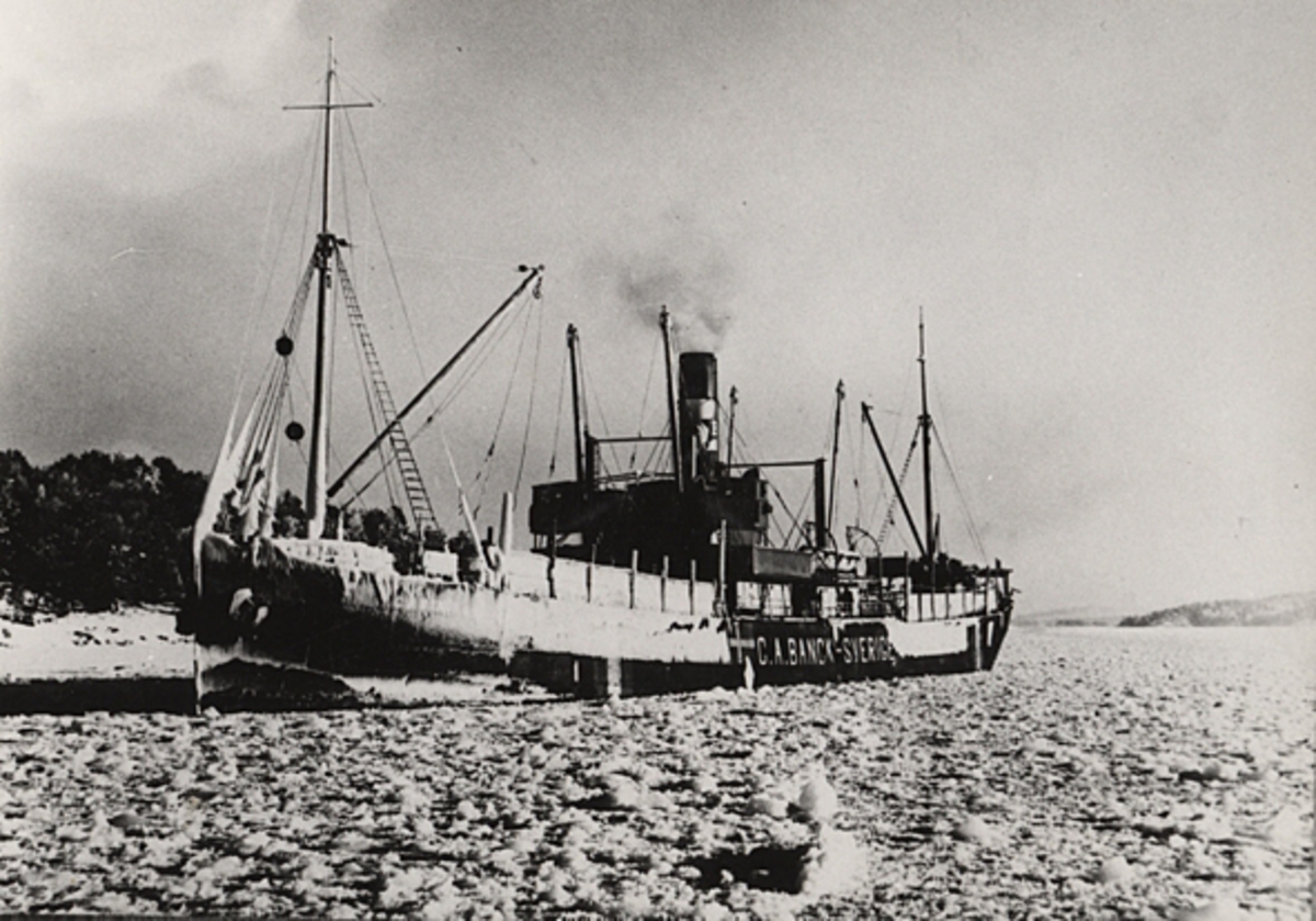 Foto i svartvitt visande lastångfartyget "C.A. BANCK" av Hälsingborg, manöverodugligt. Obs! 2 st. bollar i fören.