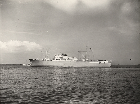 Foto i svartvitt visande lastmotorfartyget "COOLANGATTA" i Köpenhamn under år 1954.