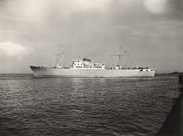 Foto i svartvitt visande lastmotorfartyget "COOLANGATTA" i Köpenhamn under år 1954.