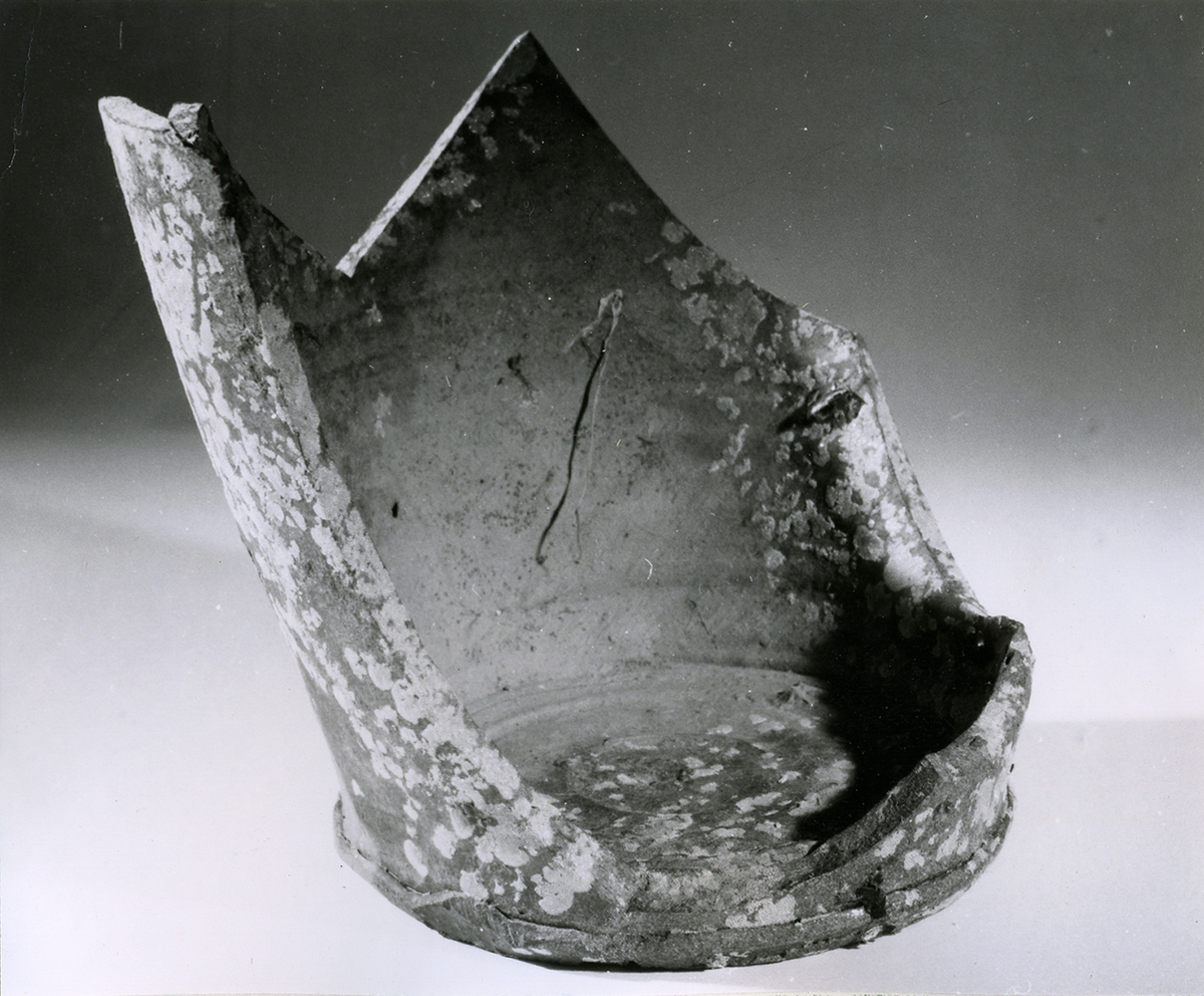 Botten till stengodskruka, brunaktig ytterglas, från vraket Marianne i Stockholms län, vid Simpnäs.