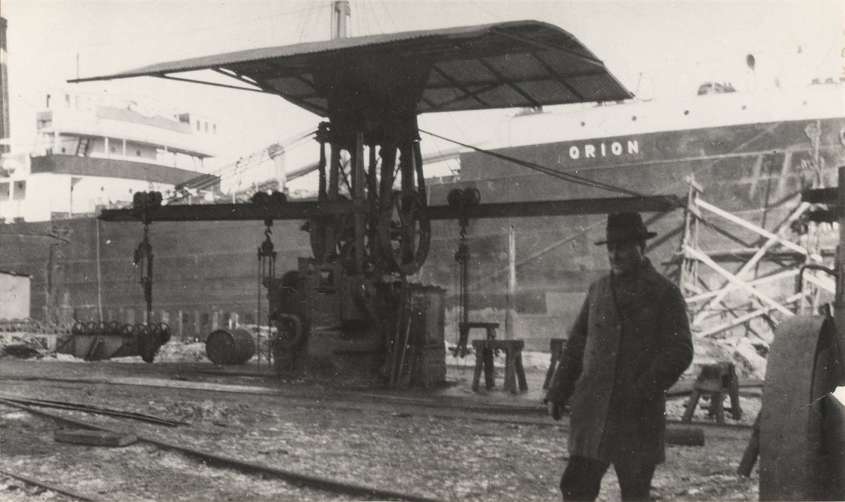 Oskarshamns varv vid mitten av 20-talet. Plåtpress på "Verkstadsplan", nu skrotad. Kom eventuellt från Södra varvet. T.v. manhål om 300x500 mm. På hitsidan sax. På bortsidan stansverktyg för stansning av hål. Pressbord kom senare. Mannen t.h. är K.A. Wimmergren. I Bakgrunden lastångfartyget ORION vid utrustningskajen. Längst t.h. skymtar en vals. Ännu en press stod t.v.