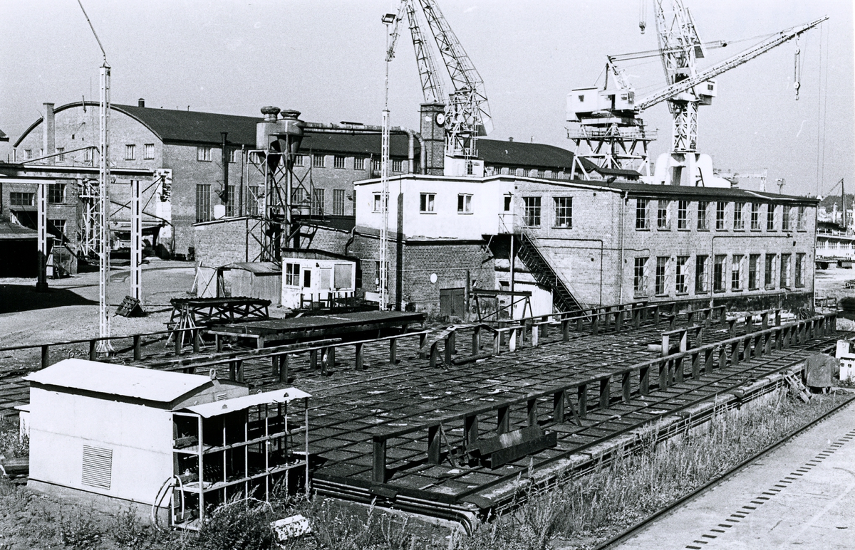 Oskarshamns varv. Nya stapelbädden. Svetsplan 6, Snickeriet. I bakgrunden verkstad 14.