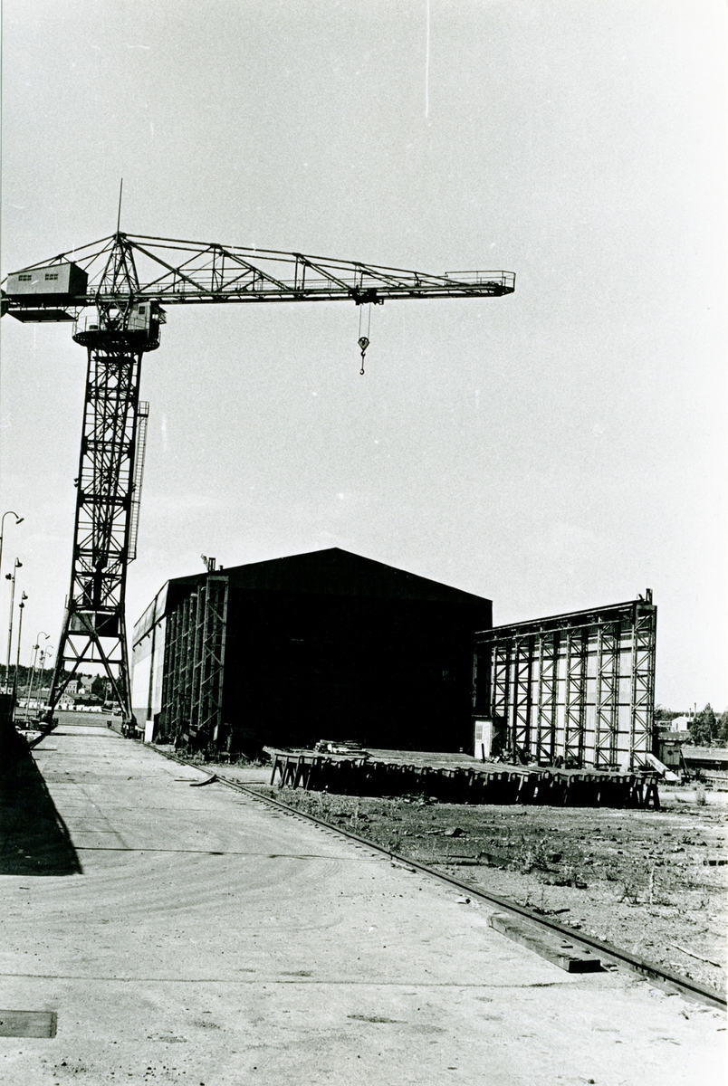 Oskarshamns Varv. Nya stapelbädden. Svetshallen. Kranen inköpt 1953. Lyftkran 15000 kg. Maskinfabriken Hensen, Rotterdam, Holland.