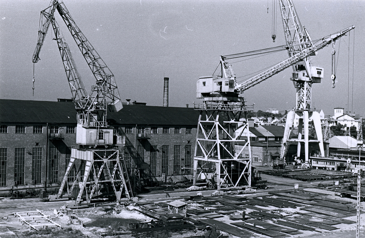 Oskarshamns varv. Plåtverkstad 14. I bakgrunden centralförrådet. Till vänster Kockums i mitten portalkran, lyftkraft 36 ton, Industrial palnts Corporation. Till höger portalkran, lyftkran 40 ton, kampnagel A/G, Hamburg.