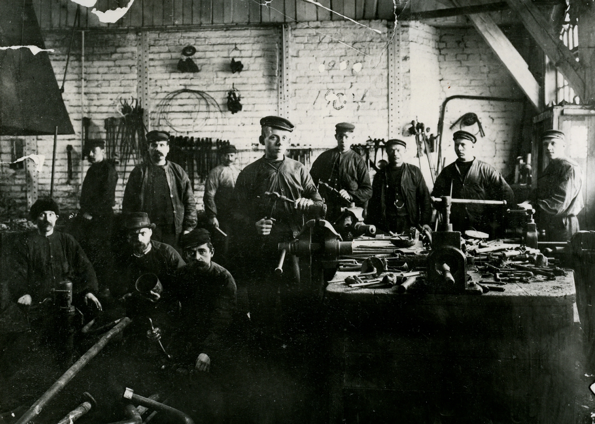 Interiör från kopparslagare verkstaden. Mannen med mustach är troligen förmannen Lind.
