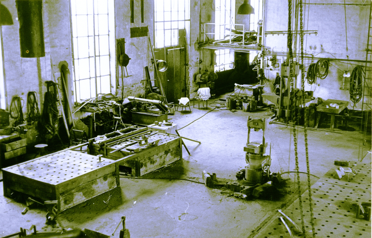 Oskarshamns varv. I förgrunden hydraluisk rörbockningsmaskin, riktplanar. vid dörren vinkelkapsåg.