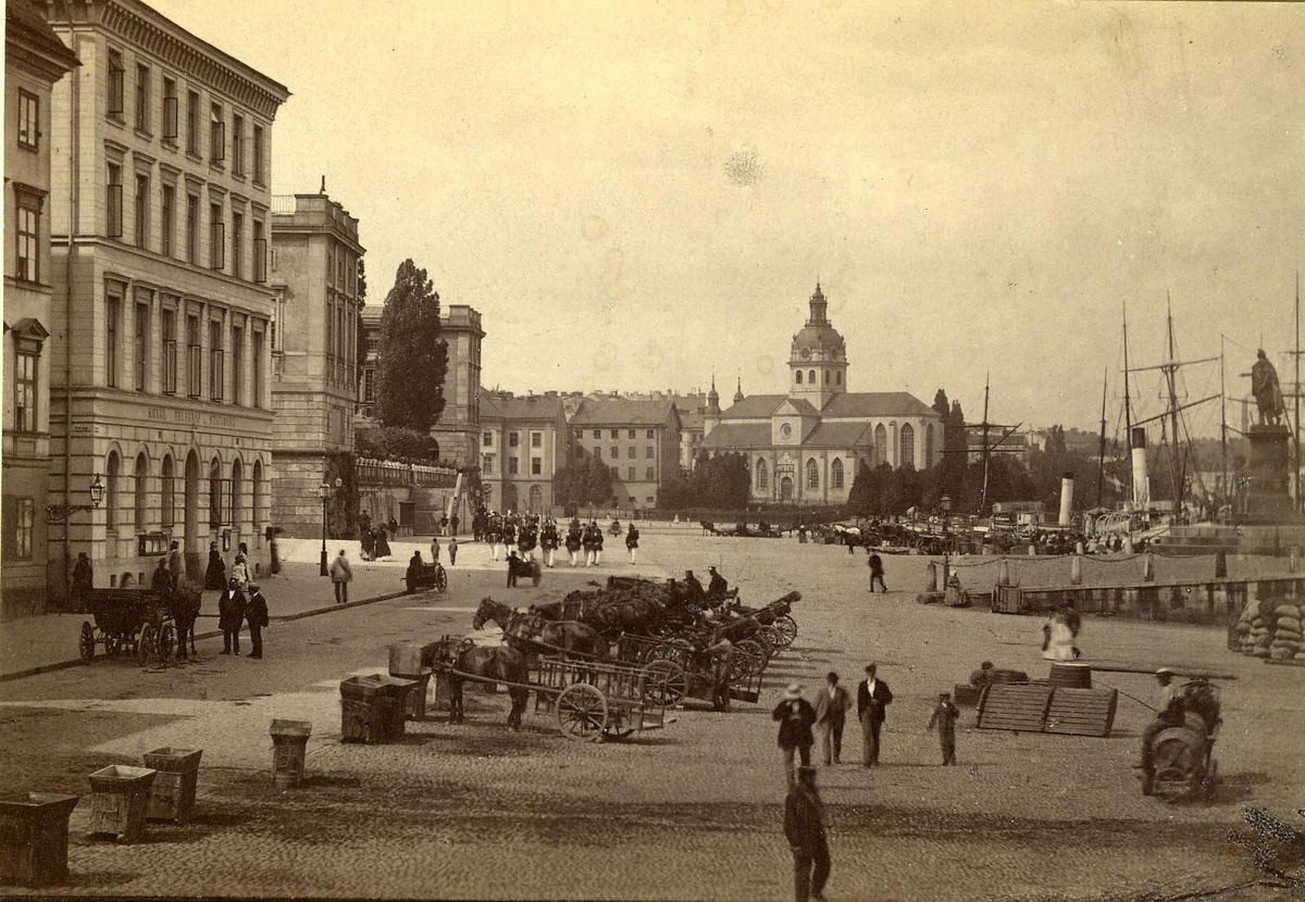 Skeppsbron, norra delen. I bakgrunden Jacobs kyrka.