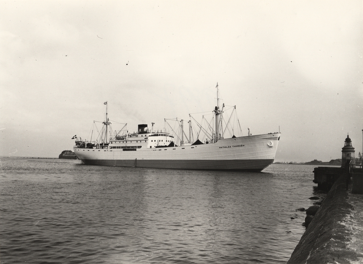 Titel: Foto i svartvitt visande lastmotorfartyget "MATHILDA THORDÉN" taget i Köpenhamn under år 1954.