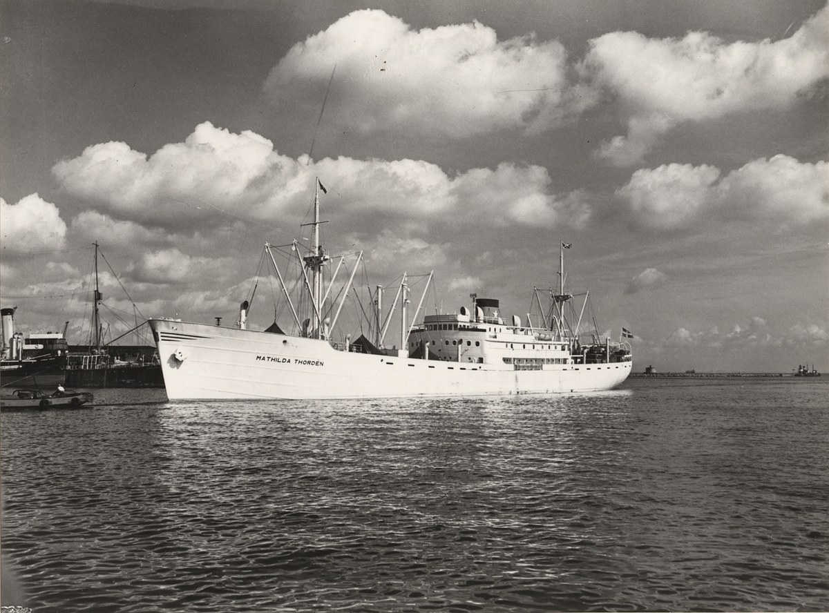 Foto i svartvitt visande lastmotorfartyget "MATHILDA THORDÉN" taget i Köpenhamn under 1950-talet.