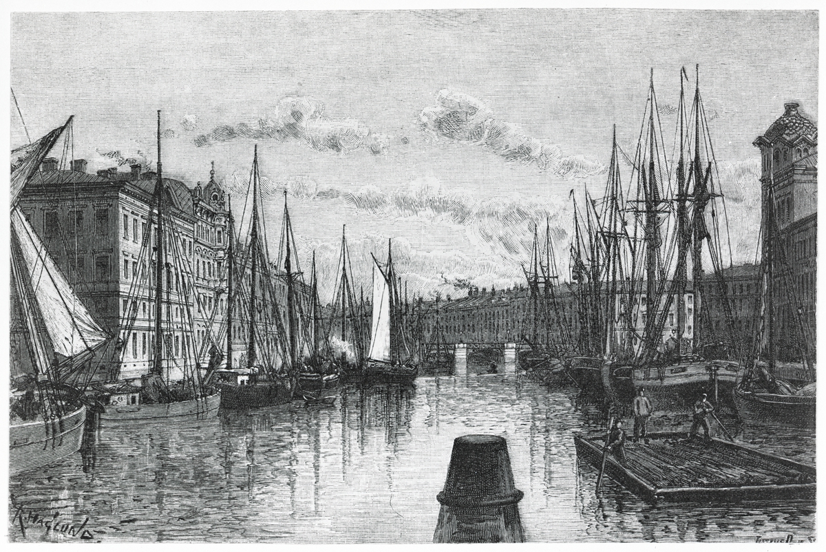 Träsnitt eller Zylografi visande hamnen i Göteborg omkring 1870.