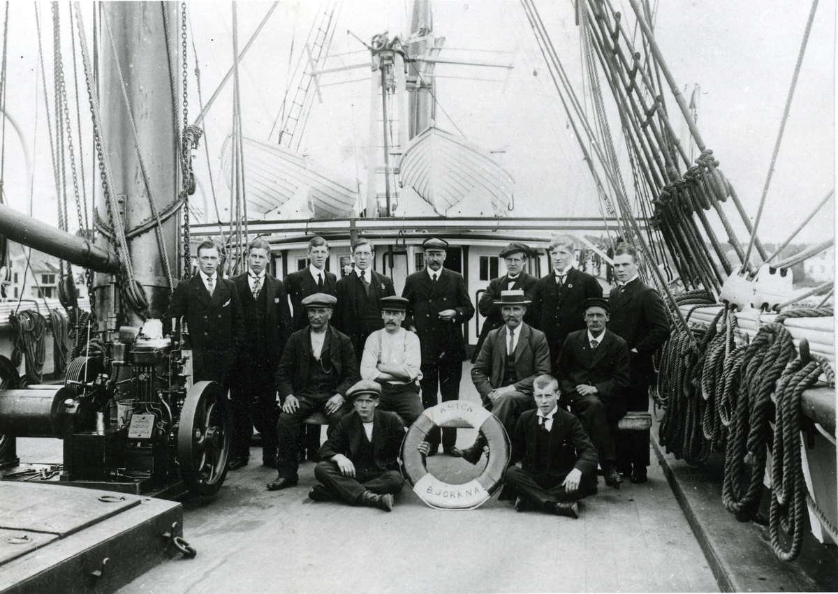 Barken Anton av Väddö. Besättningen fotograferad på däck, ...[olika antaganden...] Kopia i Roslagens Sjöfartsmuseum, Elmsta