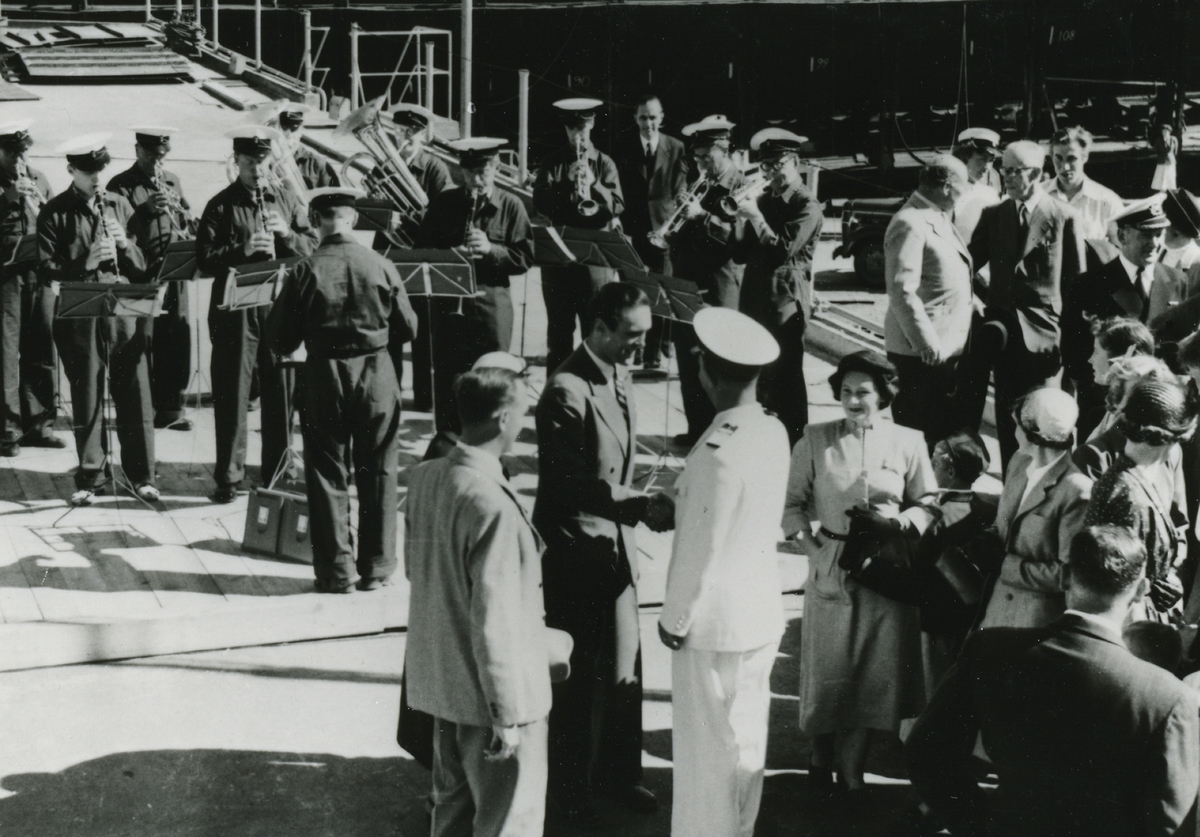 Oskarshamns varv. musiken spelar vid Fartygsdopet 1.7.1952.