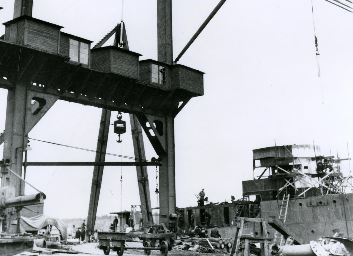 Oskarshamns varv. Maskinhus för linbanan. Minsvepare i bakgrunden.