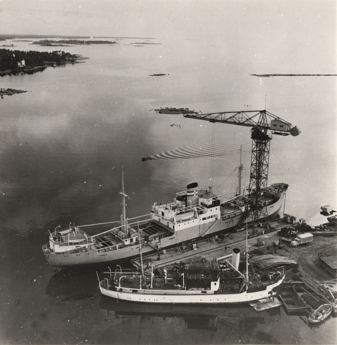 Oskarshamns. Lastångfartyget BORE VI av Åbo längre bort. September 1957.