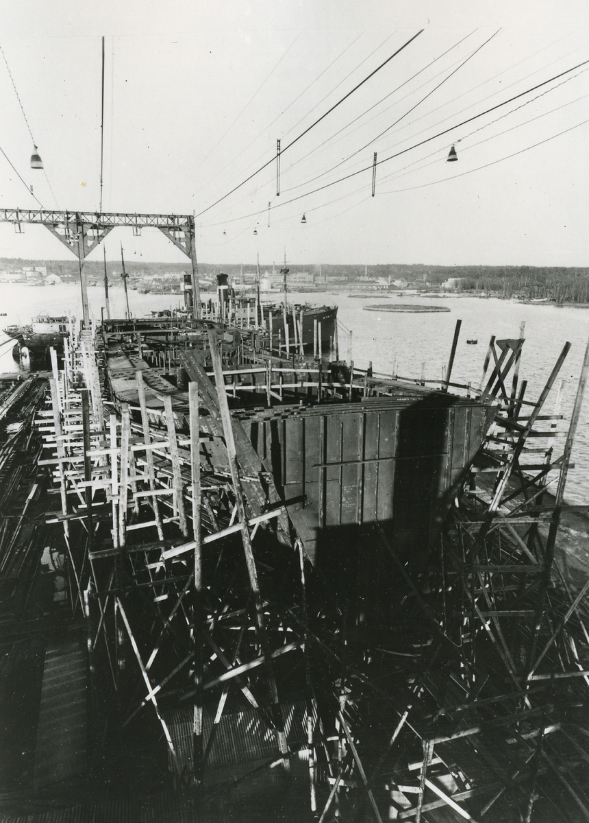 Titel: Lastångfartyget ÖDEMIS (HEIMDALL) under byggnad vid Oskarshamns varv.