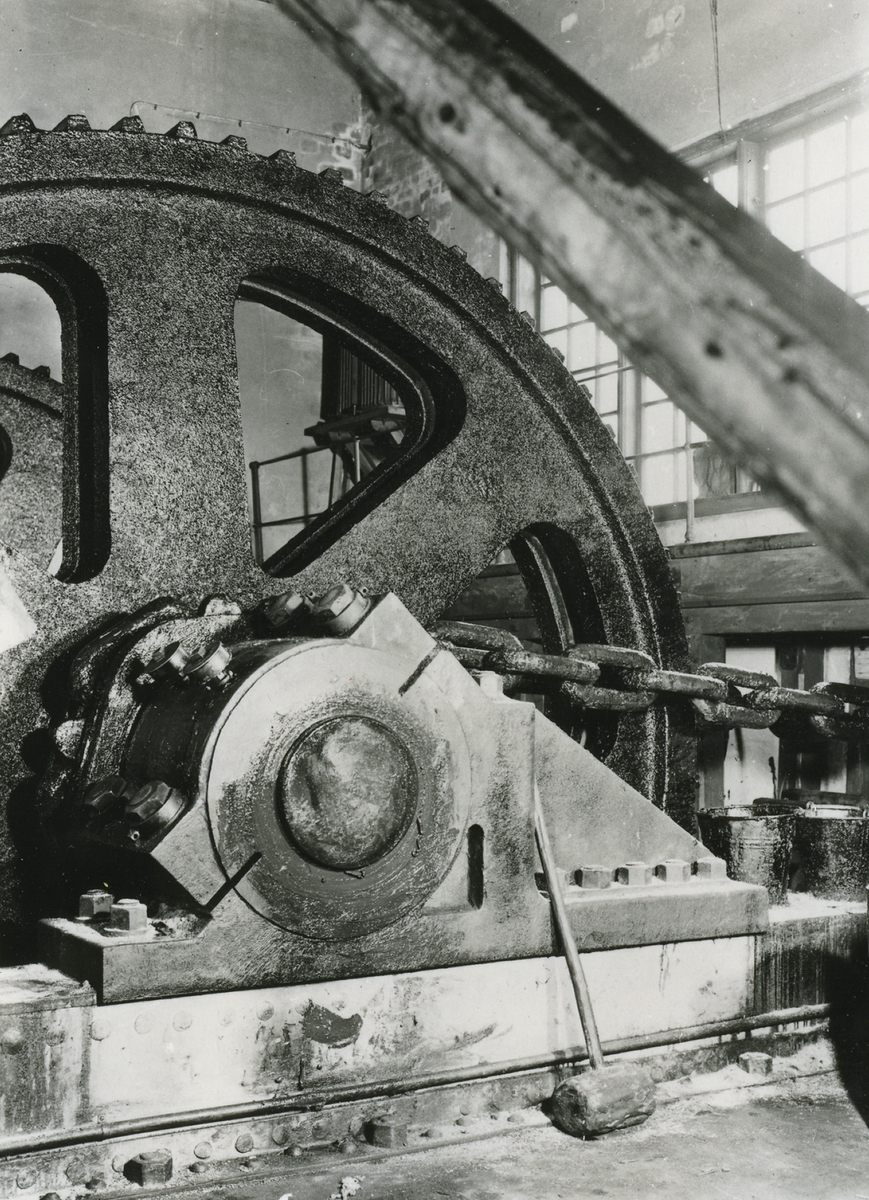 Oskarshamns varv. Maskin till stora slipen. Träklubban användes för att slå loss kedjan när den fastnade.