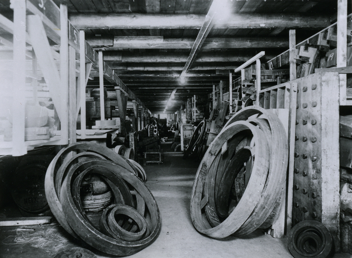 Oskarshamns varv. Gjutmodellförådet med kanningar i förgrunden.