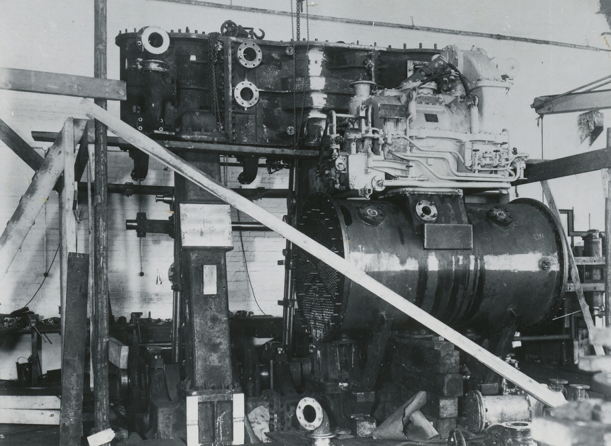 Oskarshamns varv. ATAIR`s maskin provmonteras i maskinverkstaden.