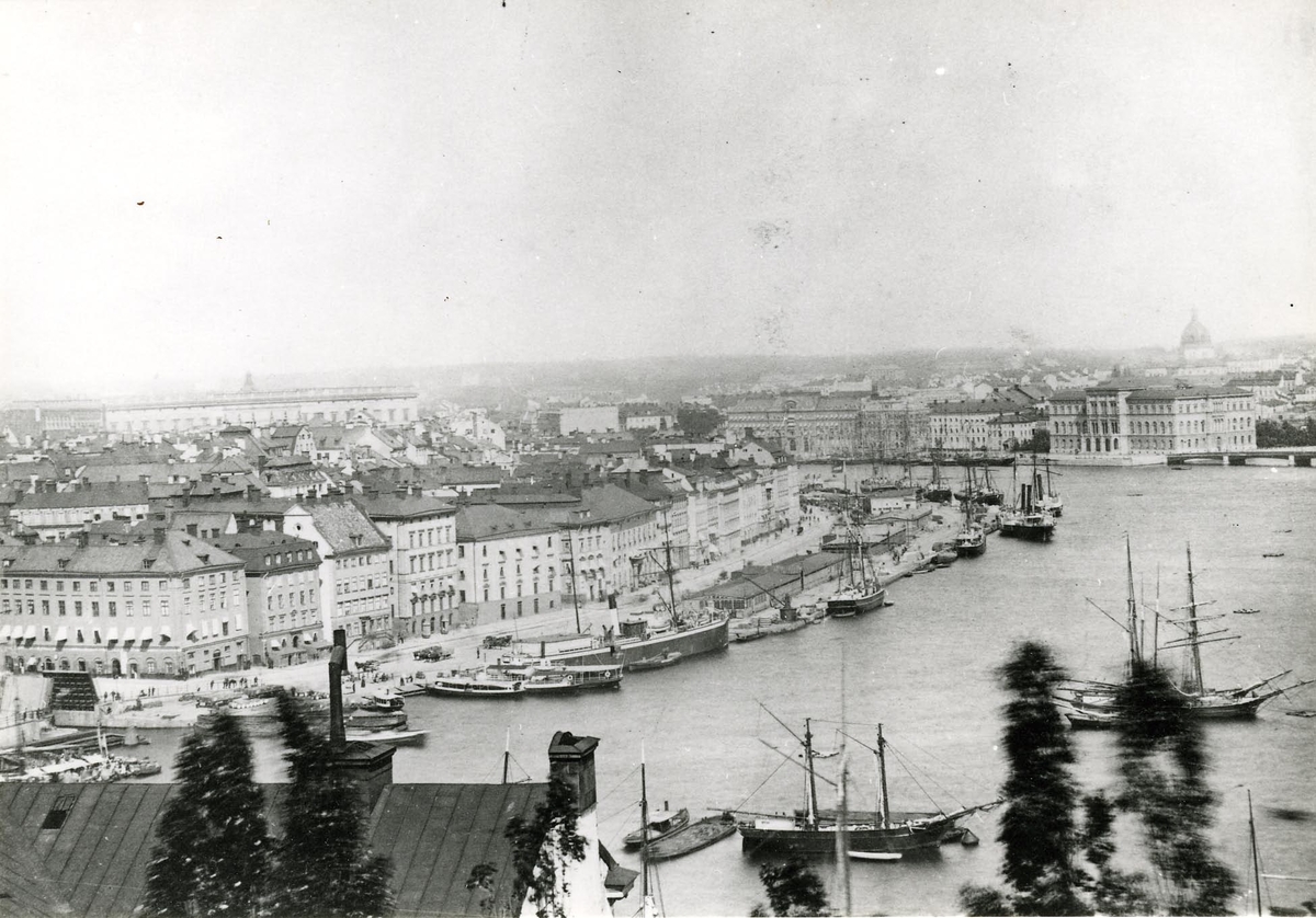 Stockholm: Skeppsbron 1877-1883. Panorama i 2 delar. Högra delen se under Munkbrohamnen.