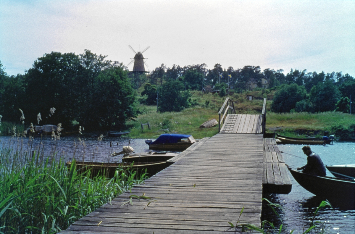 Båtar vid brygga på Utö. I bakgrunden Utö Kvarn.