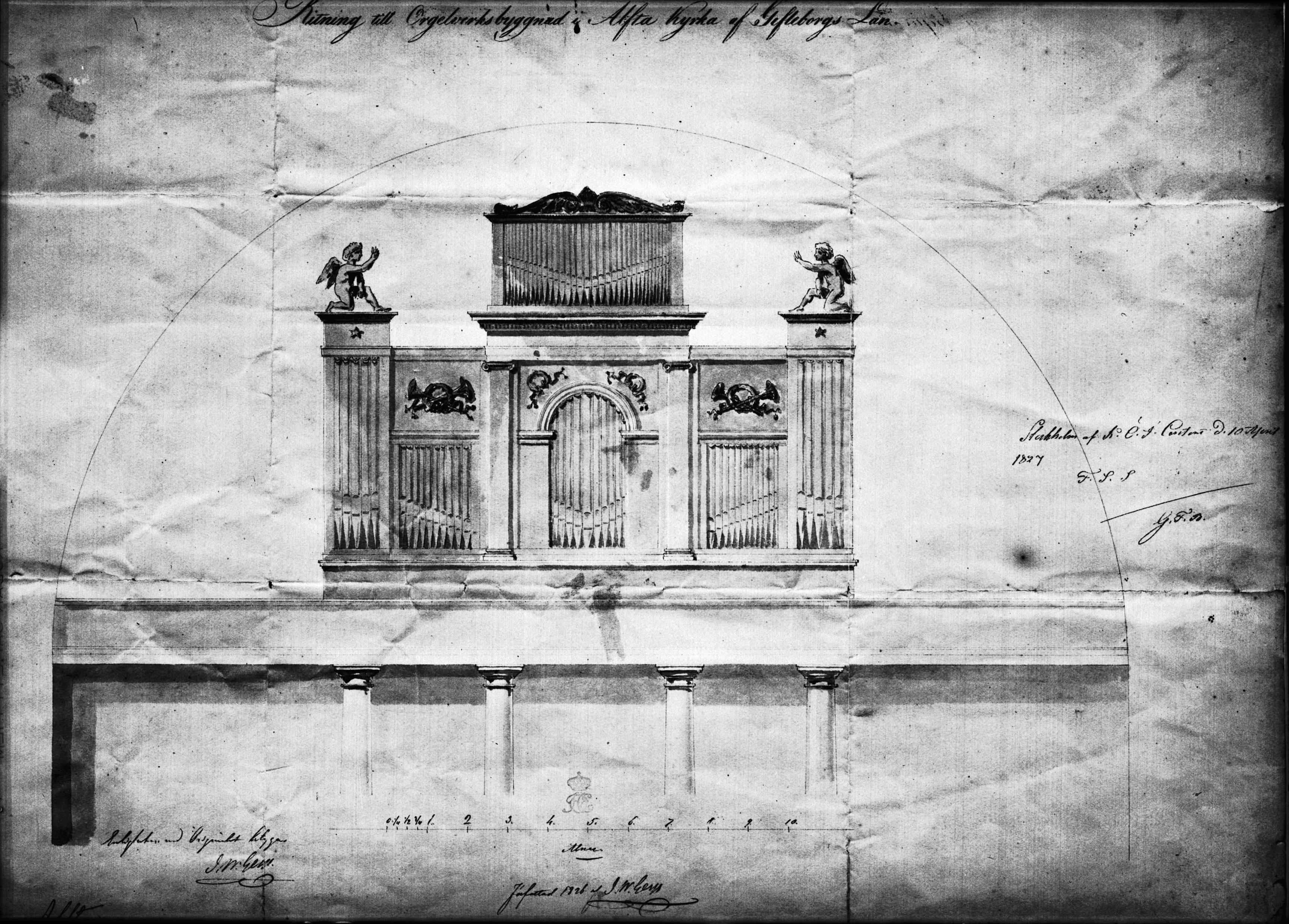 Orgelfasad. Foto efter ritning. Original i Kungliga Byggnadsstyrelsen.