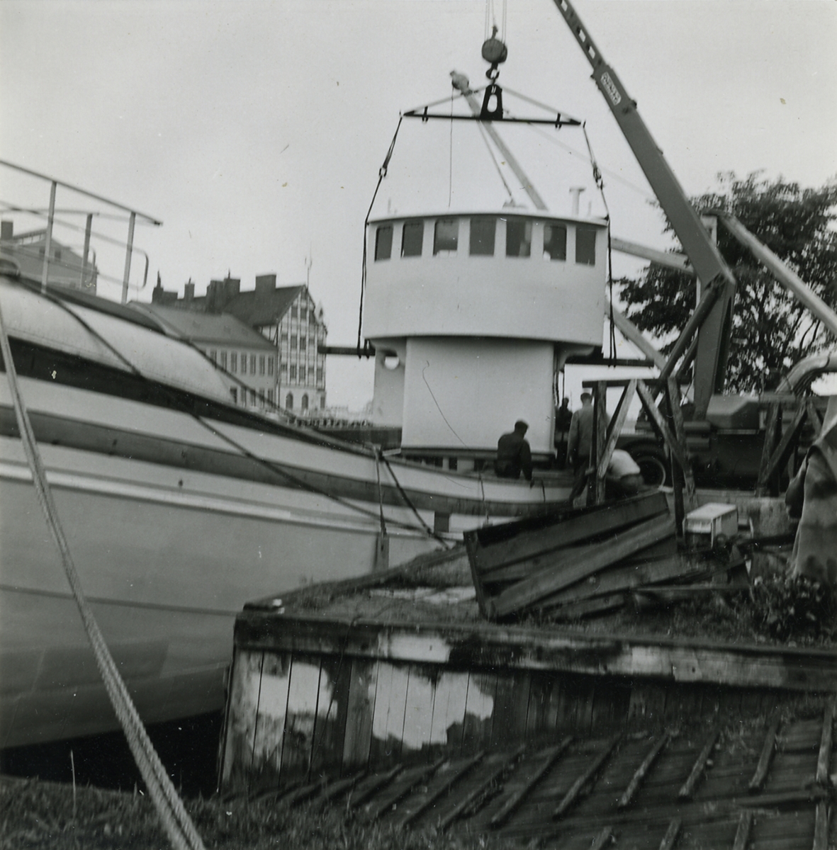 Nybygget nr 92, en fiskebåt till ett fiskelag i Bohuslän, ligger vid varvets utrustningskaj och det helt färdigställda däckshuset lyftes ombord dels med förhyrd transportkabel kran, dels med varvets egen stationära kran. Kranen låter däckshuset sakta sänka sig ner över hålet i däcket. Huset vilar på balkar, som hänger i wirar.