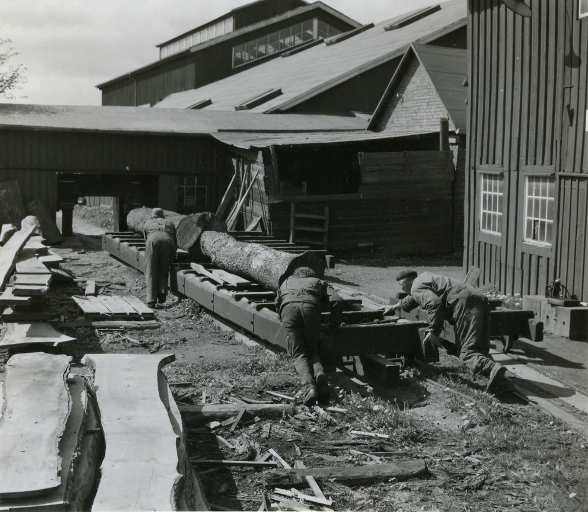 Gården framför blocksågen. Sedan ekstocken "lässats" d.v.s. upprullats på matarvagnen till sågen, framskjutes vagne på räls tills det inkopplas i matarverket. I bakgrunden stora verkstaden. Edvin Gustafsson, Larry Carlsson och Sture Nilsson skjuter på.