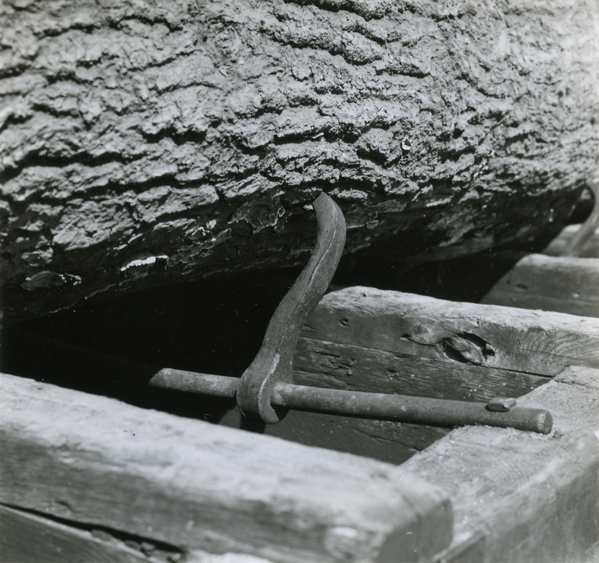 Blocksågen. Stocken fixeras i sitt läge medelst järnklor.
