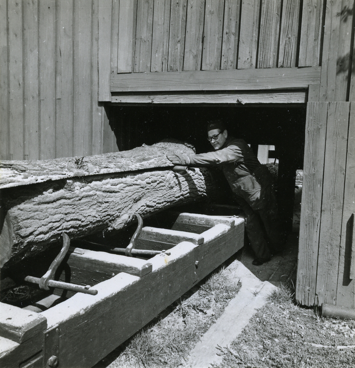 Skalplankan avrullas, sedan den sågats, med hjälp av ett metallrör som kilats emellan.