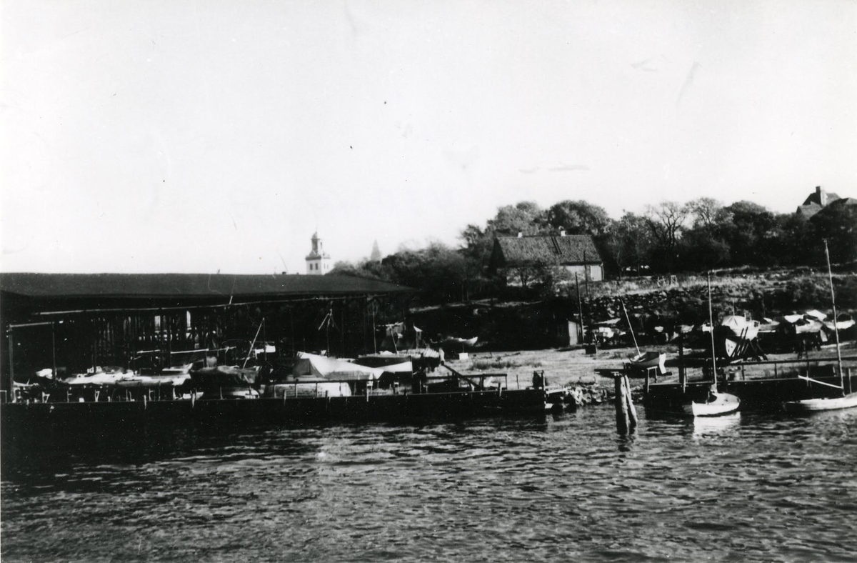 Foto i svartvitt visande hamnbild från Göteborg. I bakgrunden till vänster Carl Johans kyrkan.