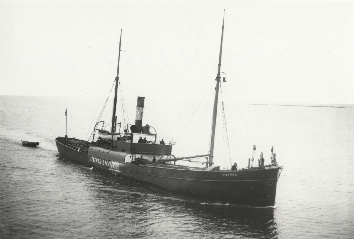 Lastångfartyget "VIKFRED" av Verkebäck, på ingående till Åhus hamn år 1919.