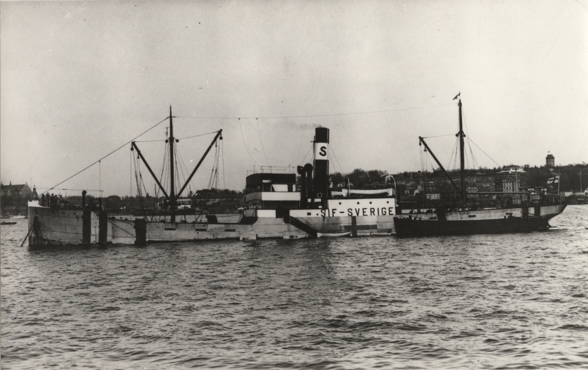 Foto visande lastångfartyget "SIF" av Stockholm, på Stockholms ström utanför Tegelviken 1916. Befälhavare var Hjalmar Olsson.
