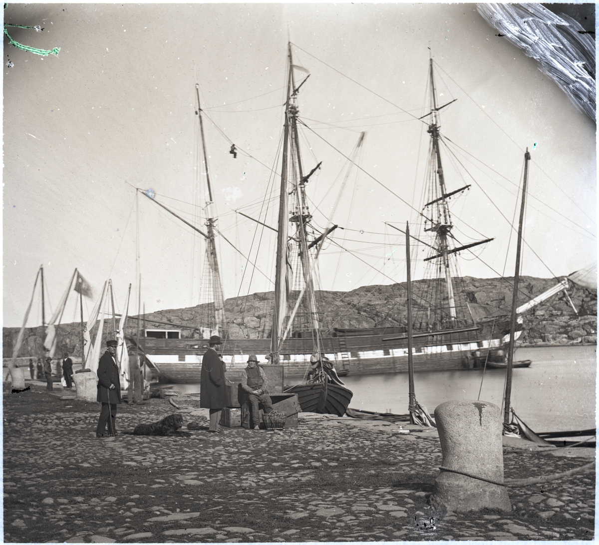 Hamnbild från Lysekil i slutet av 1890-talet. En okänd bark överhalas i hamnen.