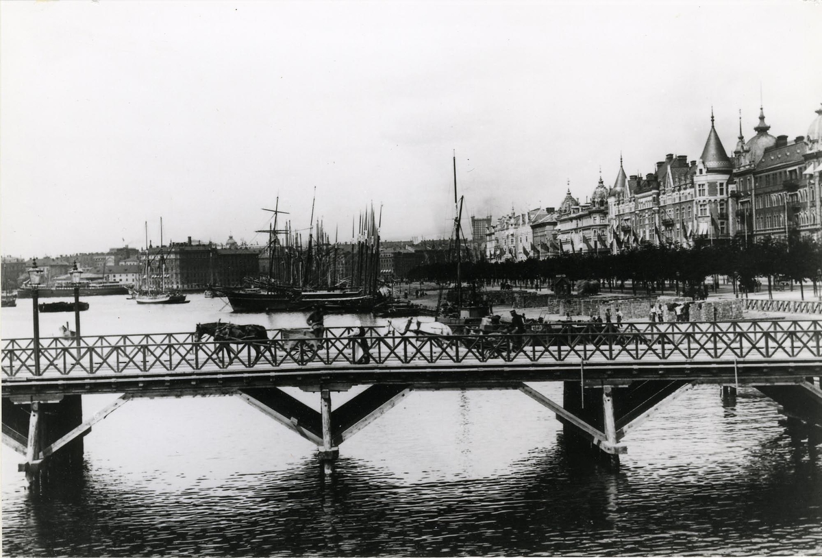 Strandvägshamnen med gamla Djurgårdsbron, före 1897.