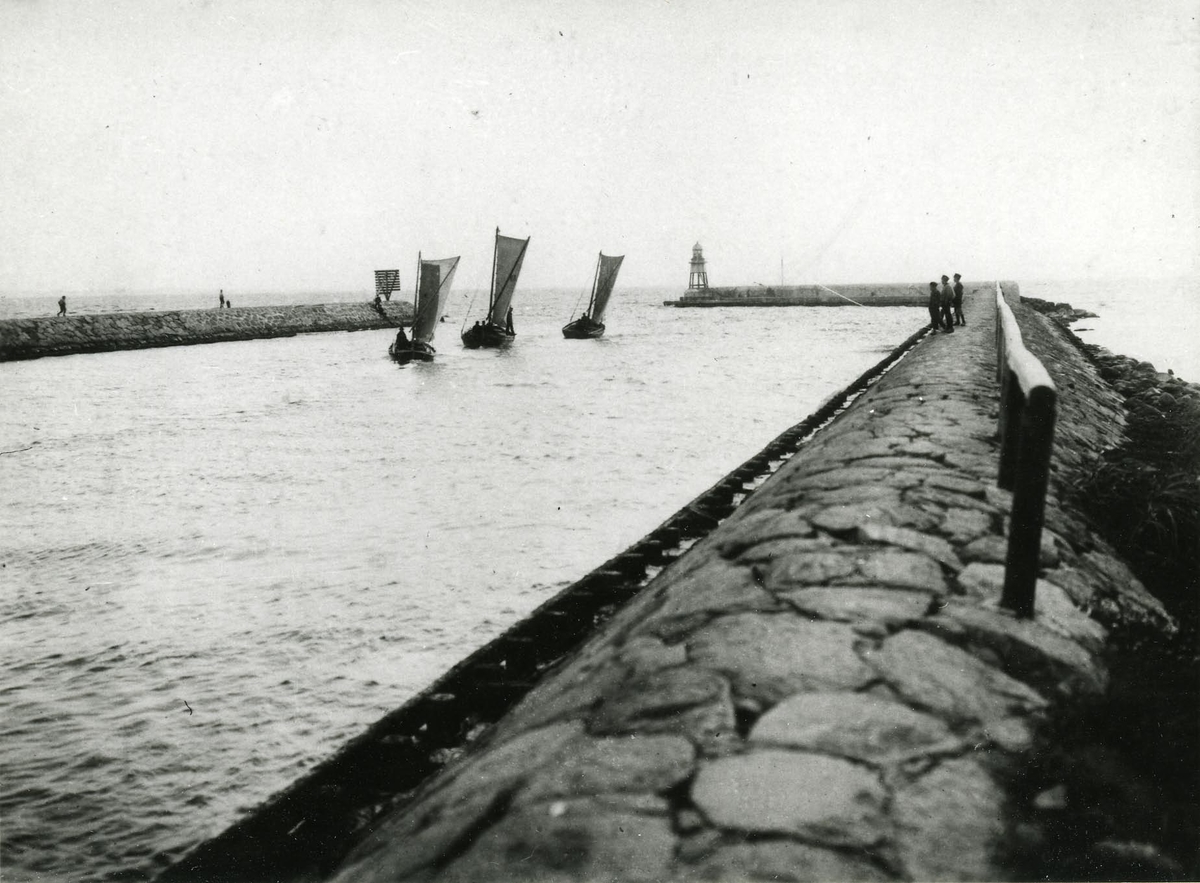 Inseglingar till Råå hamn 1902. Tre spririggade fiskebåtar i kanalen.