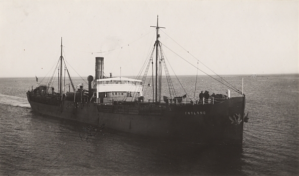 Lastångfartyg ENGLAND av Göteborg på ingående till Åhus hamn.[Felaktigt enl Tomas Johannesson, Klubb Maritim]
