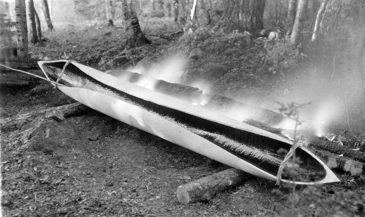 Båtämnet har tjärats invändigt och värmes nu upp för att sedan spännas ut. Obs vidjebanden i ändarna och de tydligt synliga hyvelspåren. Gåva av Institutet för folklivsforskning 1953. tryckt i Folk-Liv 1947