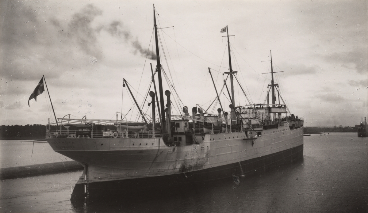 Titel: Lastmotorfartyget SELANDIA av Köpenhamn i Åhus hamn den 6 juli 1920.
